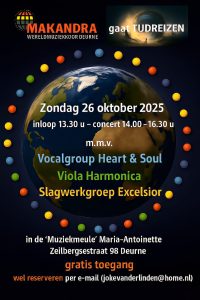 Op zondagmiddag 26 oktober, de eerste dag van de wintertijd, verzorgt Wereldmuziekkoor Makandra, samen met andere uitvoerenden, een kleurrijke muziekmiddag. Het is in de concertzaal bij de molen Marie-Antoinette van Muziekvereniging Excelsior aan de Zeilbergsestraat Deurne. Het wordt een bijzondere tijdreis over de wereld.